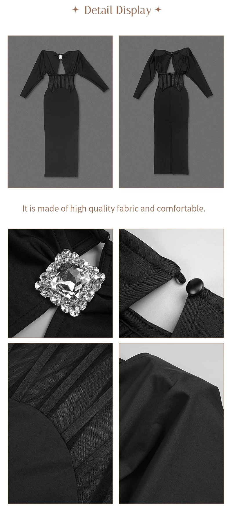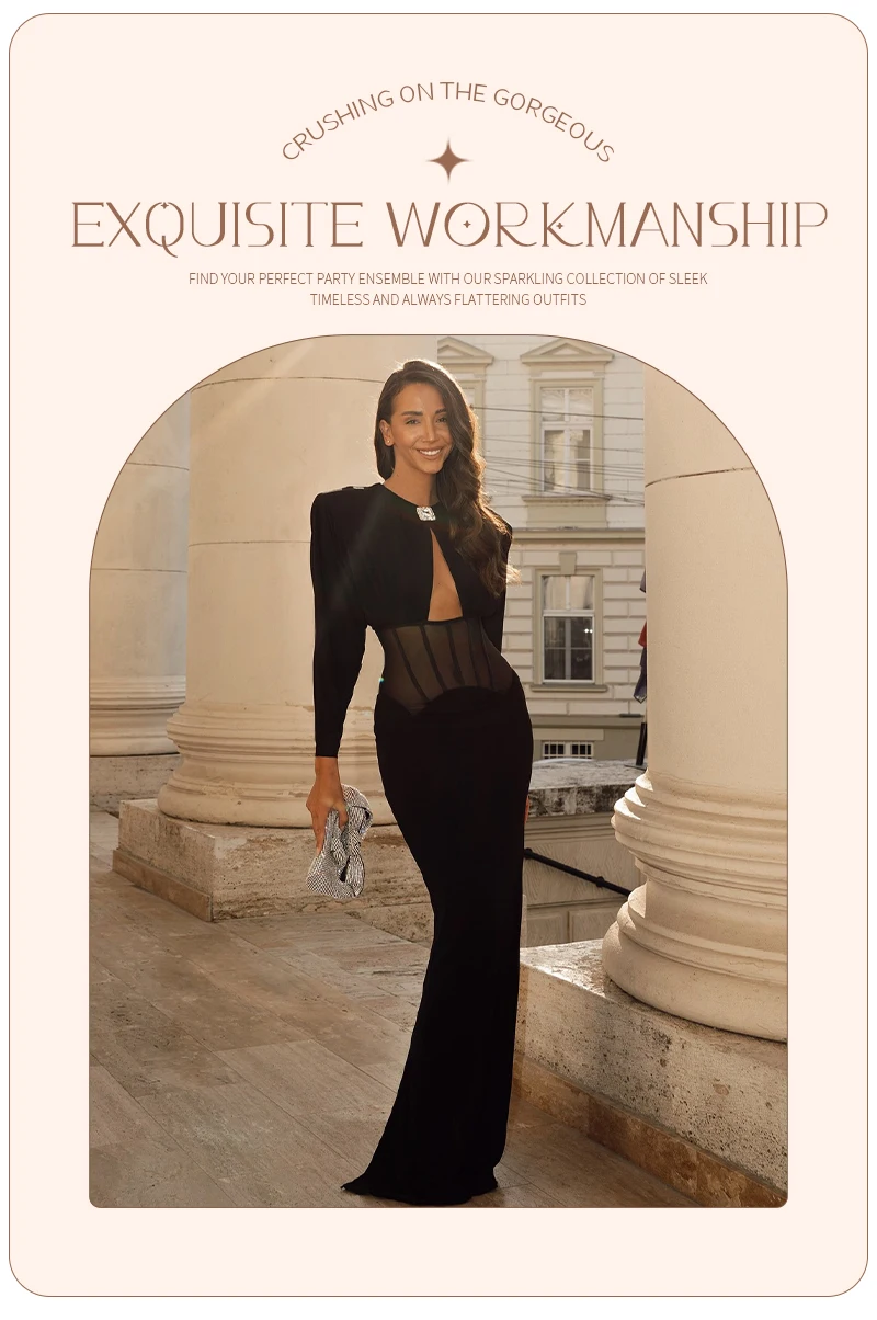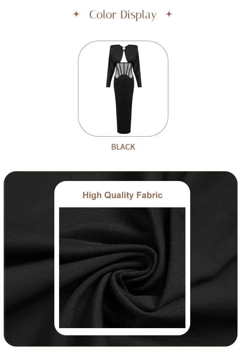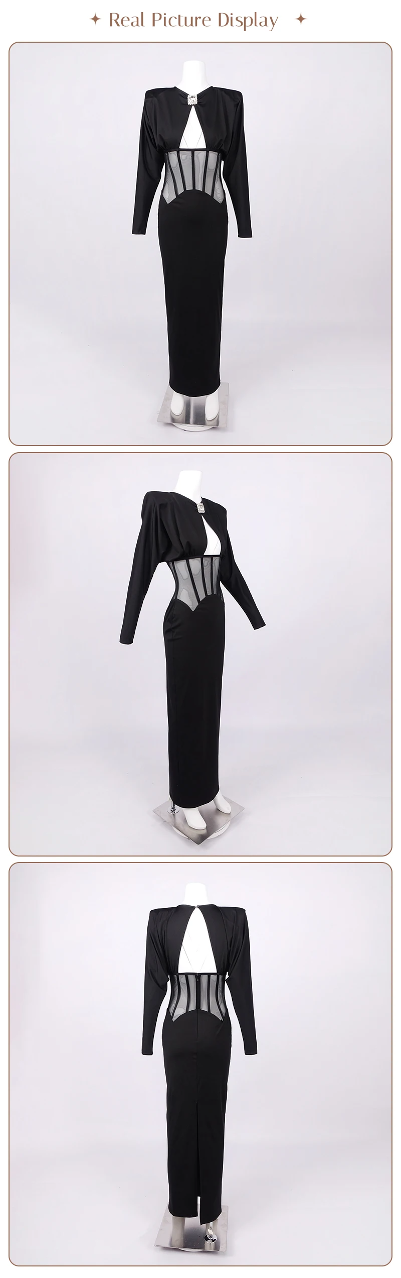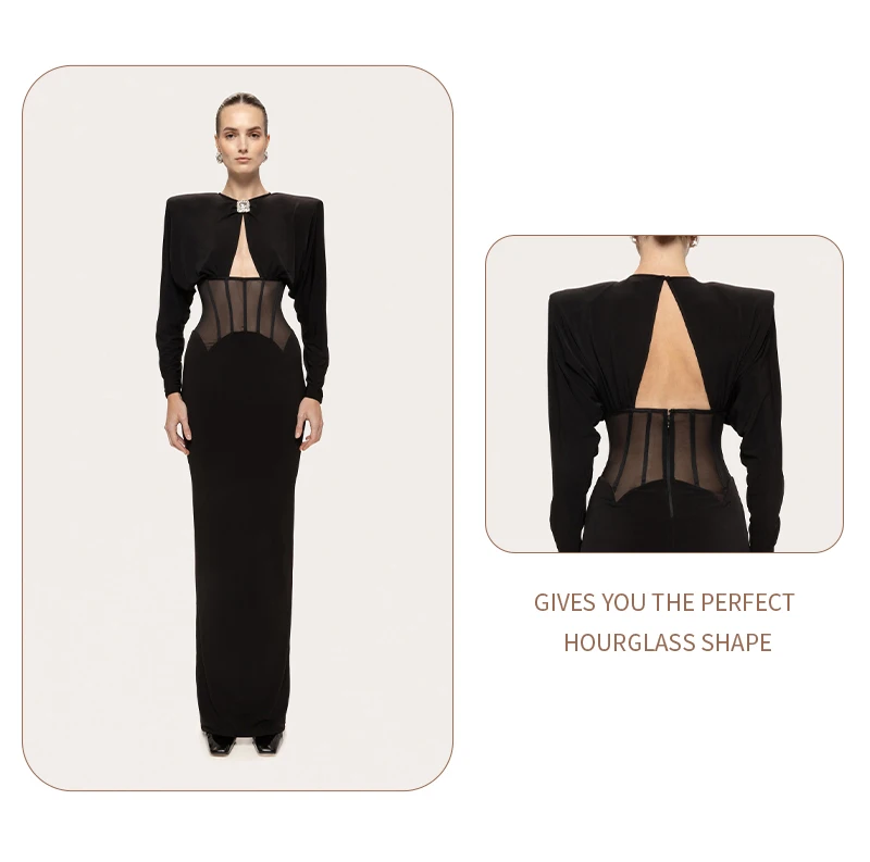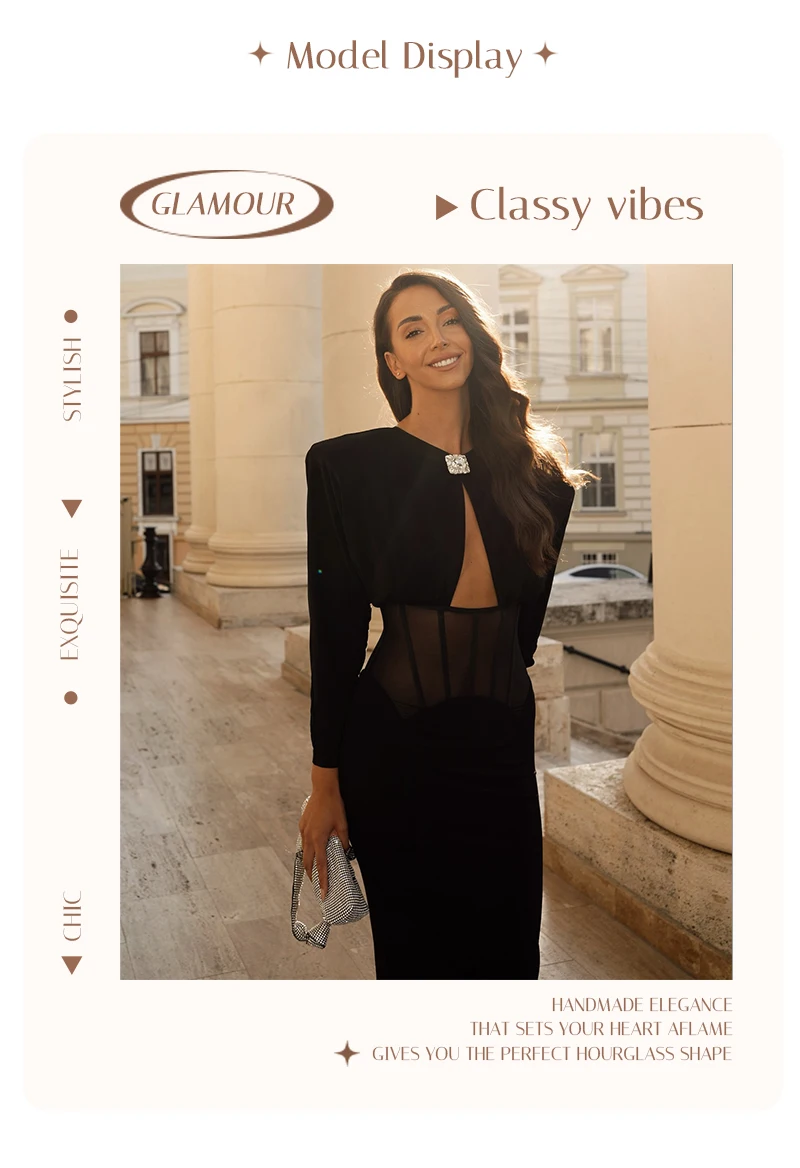 Step into timeless sophistication with this black maxi evening dress, designed to captivate at any high-end event. Featuring a structured shoulder silhouette and a sheer mesh corset waist, this gown beautifully sculpts your figure while adding a touch of modern allure. The front keyhole cutout and sparkling rhinestone brooch elevate its elegant yet daring design, making it a must-have for fashion-forward women.