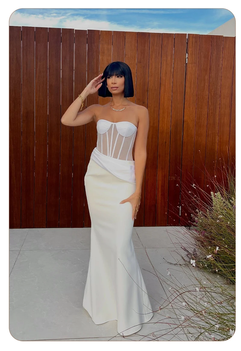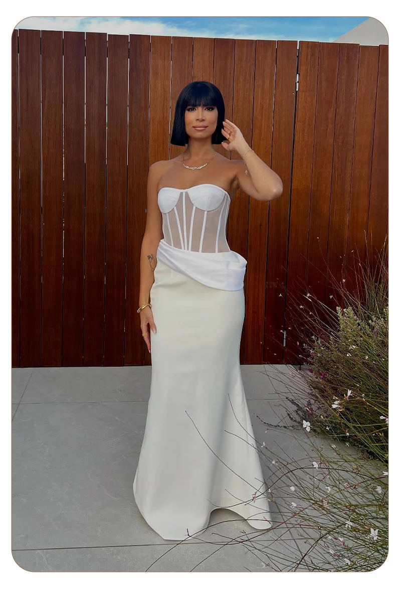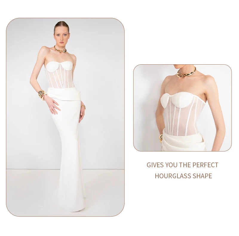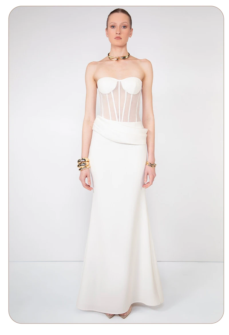 Grace meets modern edge in this elegant white corset gown, a stunning piece that redefines evening sophistication with a contemporary twist. Designed for the confident woman who loves a clean silhouette and timeless allure, this gown perfectly combines structure, femininity, and minimalism.