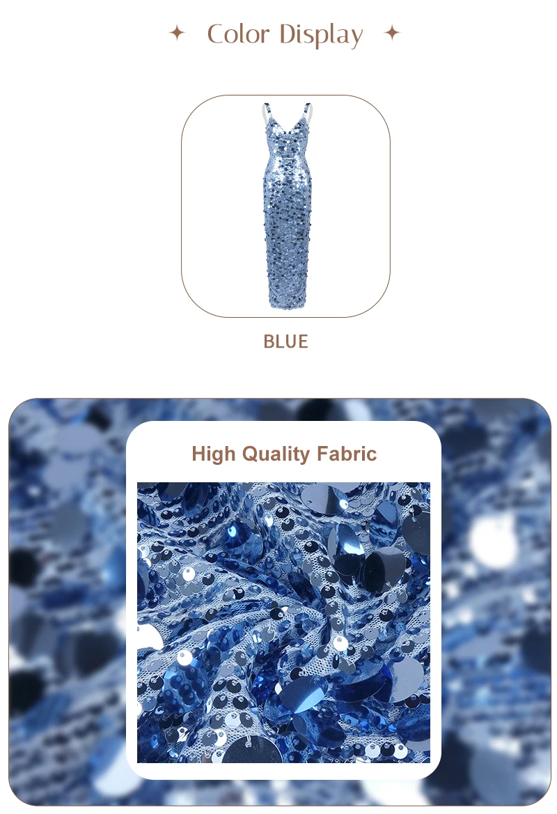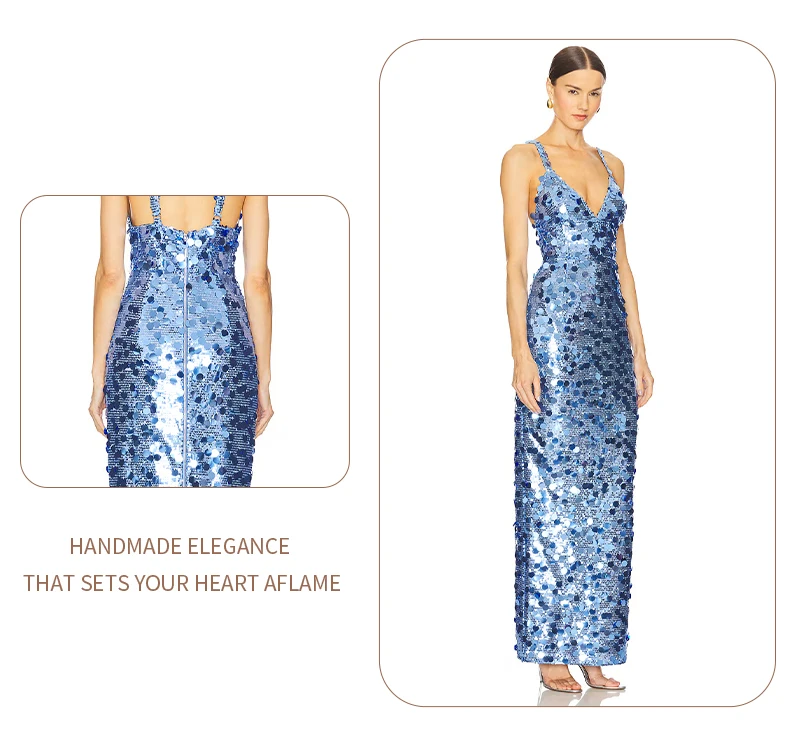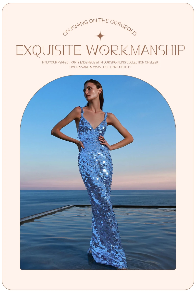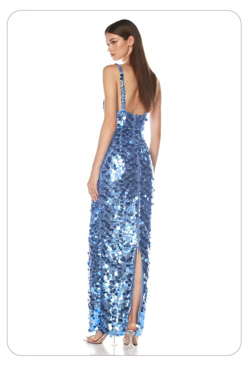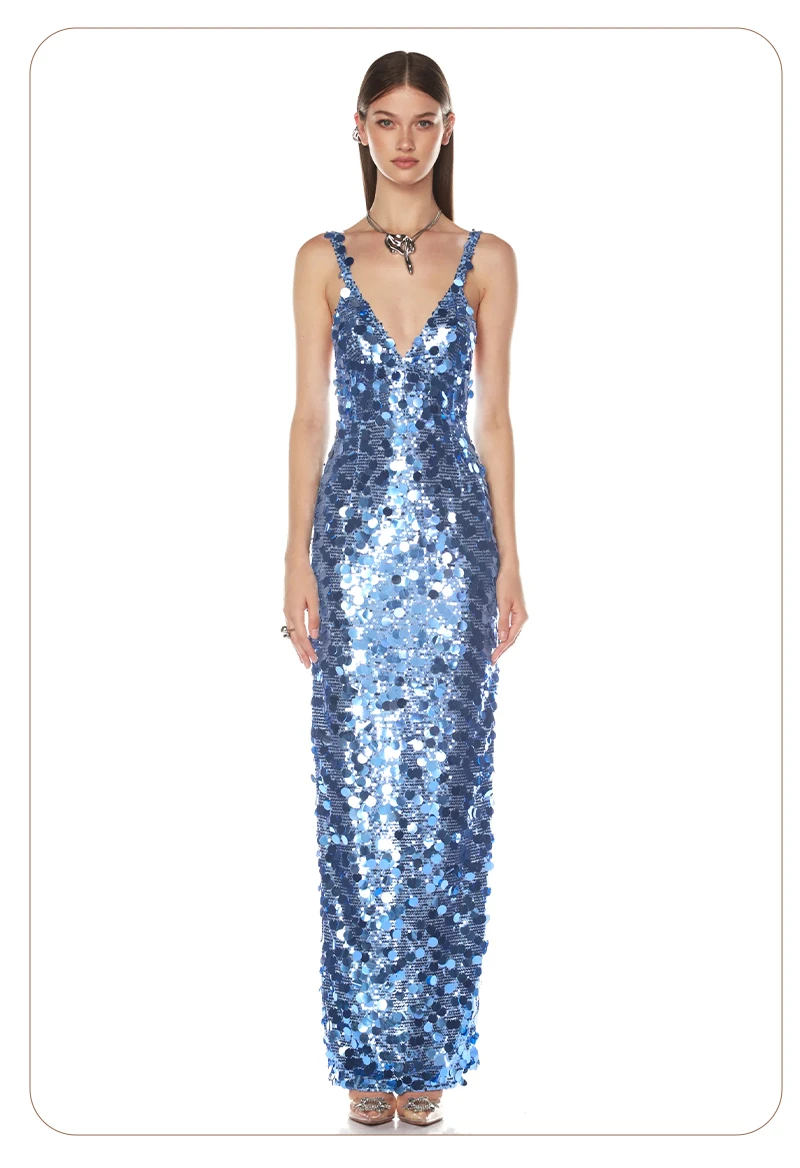 Make a dazzling entrance in this shimmering blue sequin evening gown, a show-stopping piece designed for women who embrace sophistication, glamour, and confidence. Crafted with thousands of reflective sequins in varying sizes, this gown captures light from every angle—creating a mesmerizing sparkle reminiscent of ocean waves or city lights at night.
