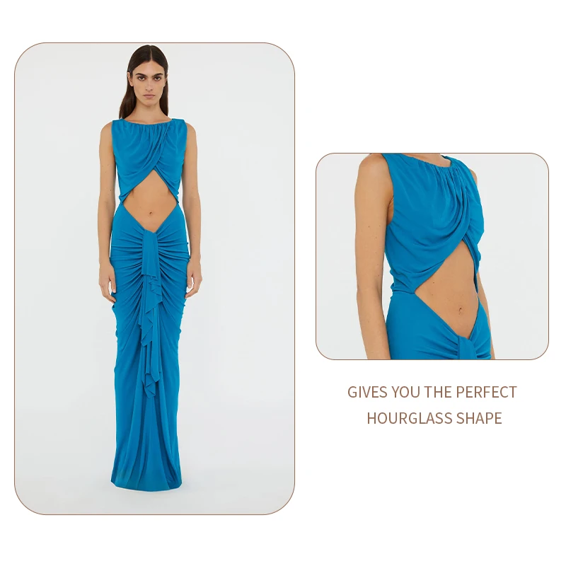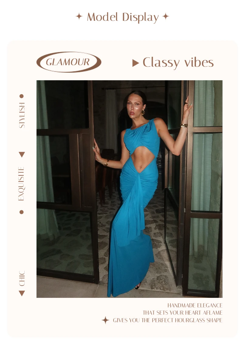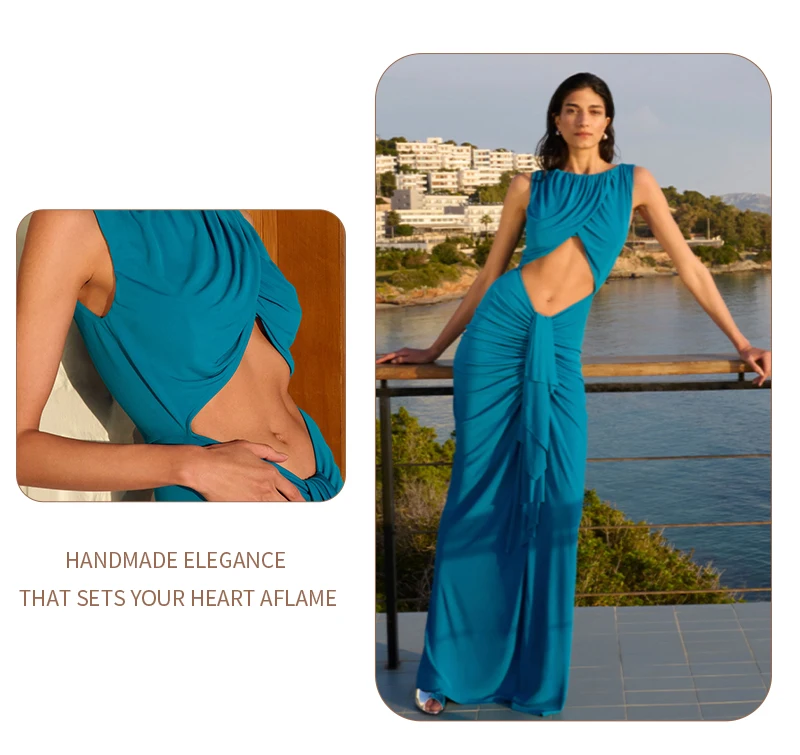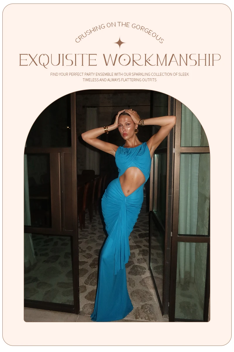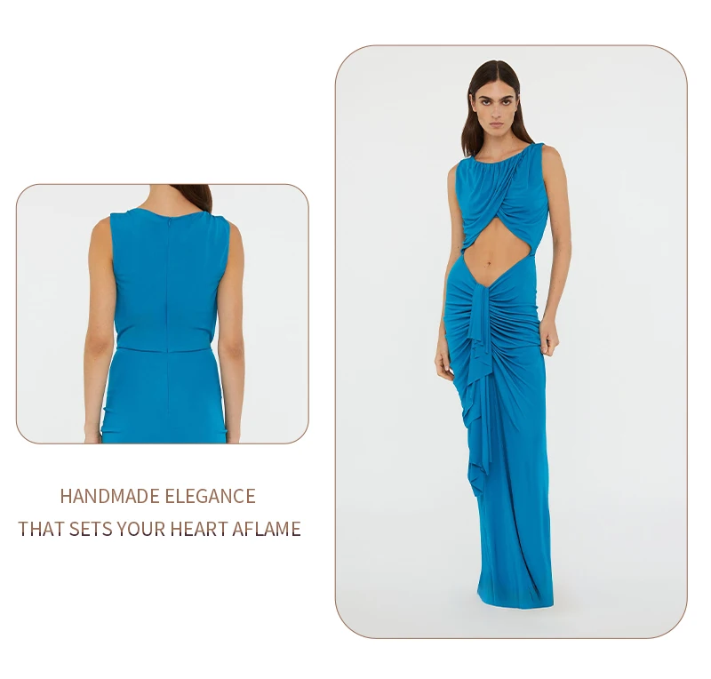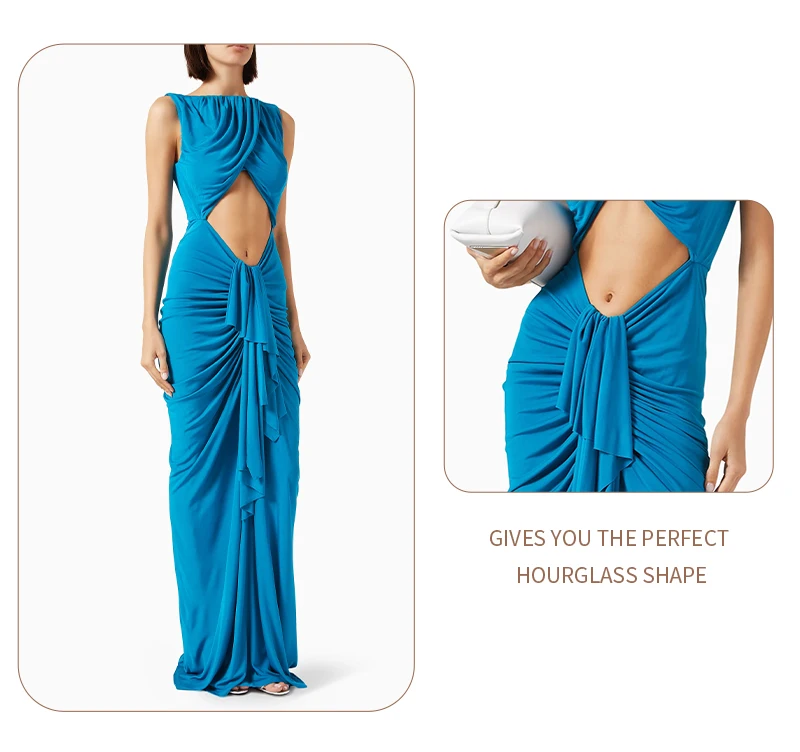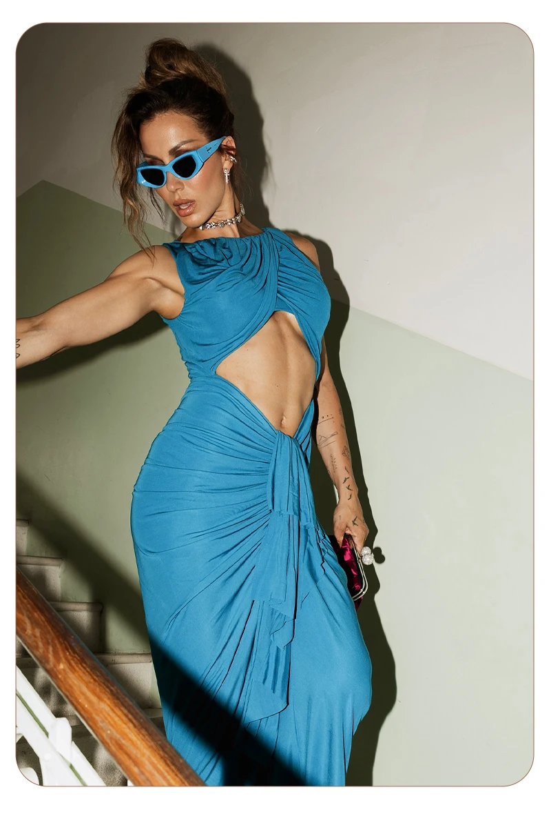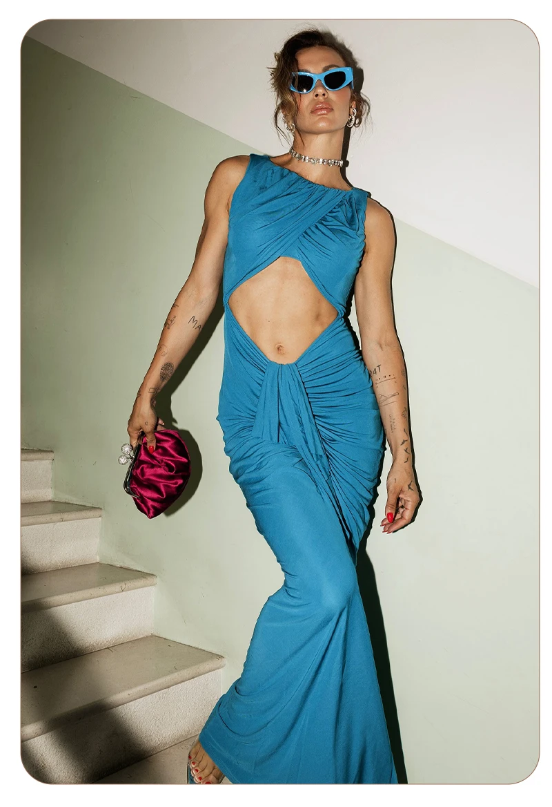 Embrace modern elegance in this cyan draped gown. The crossover - ruched top, waist cutout, and flowing skirt create a sleek yet alluring silhouette — perfect for galas or fashion - forward events where minimalist drama shines.