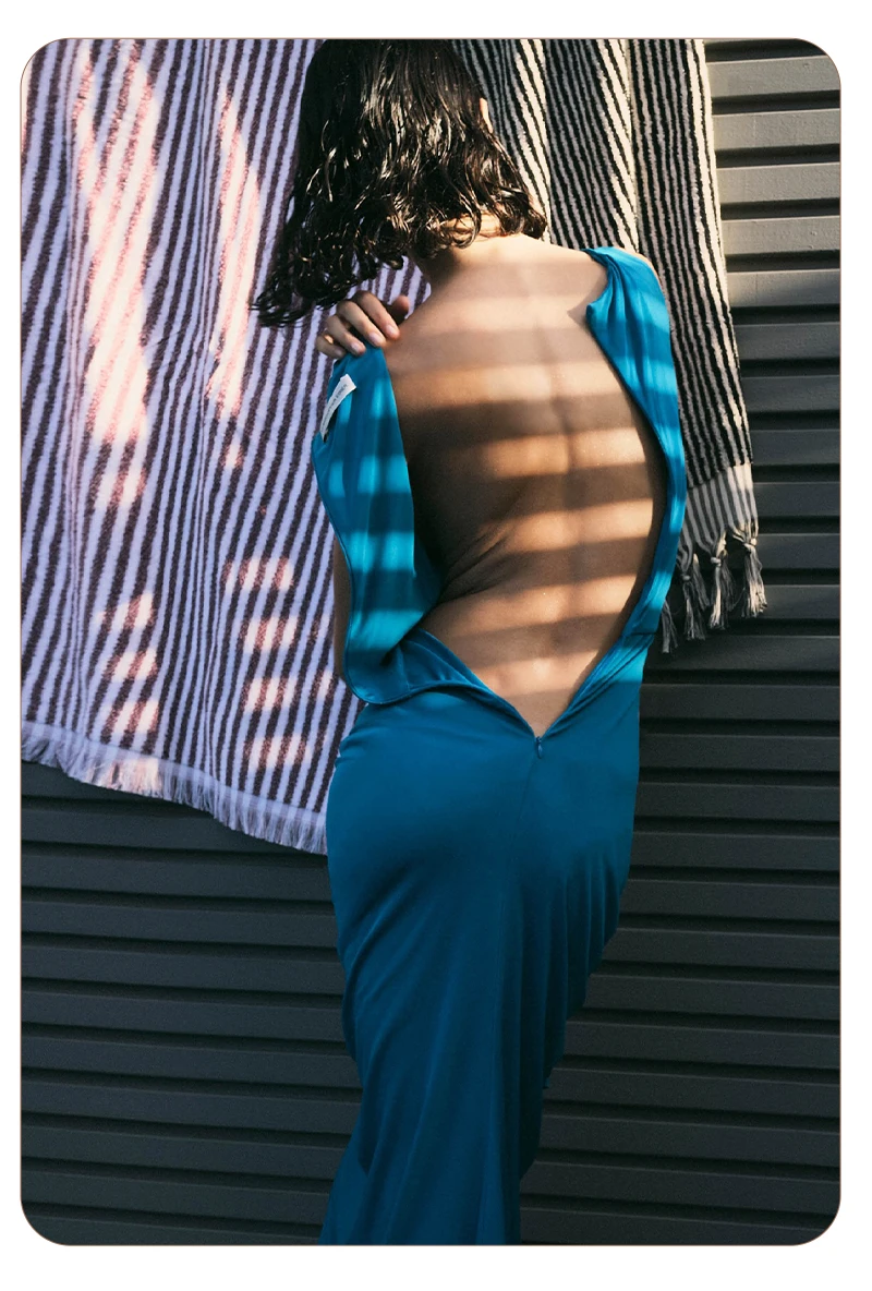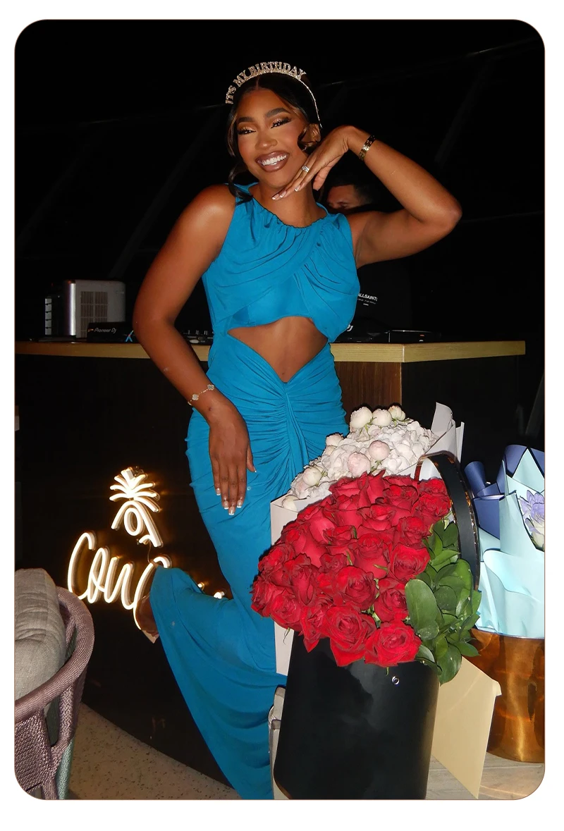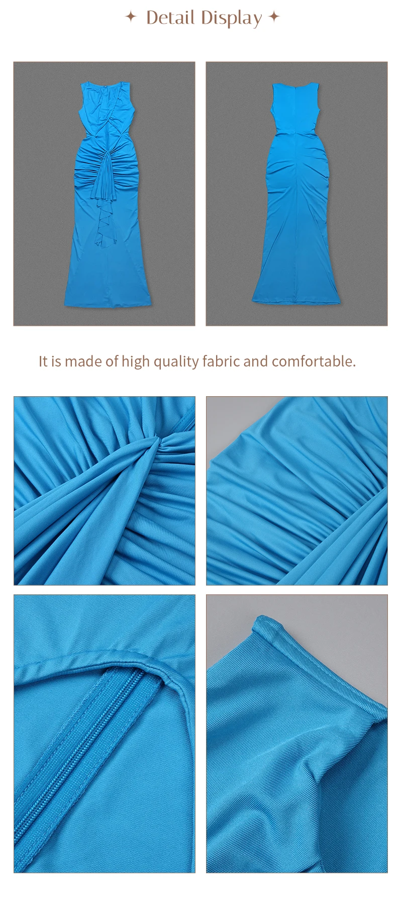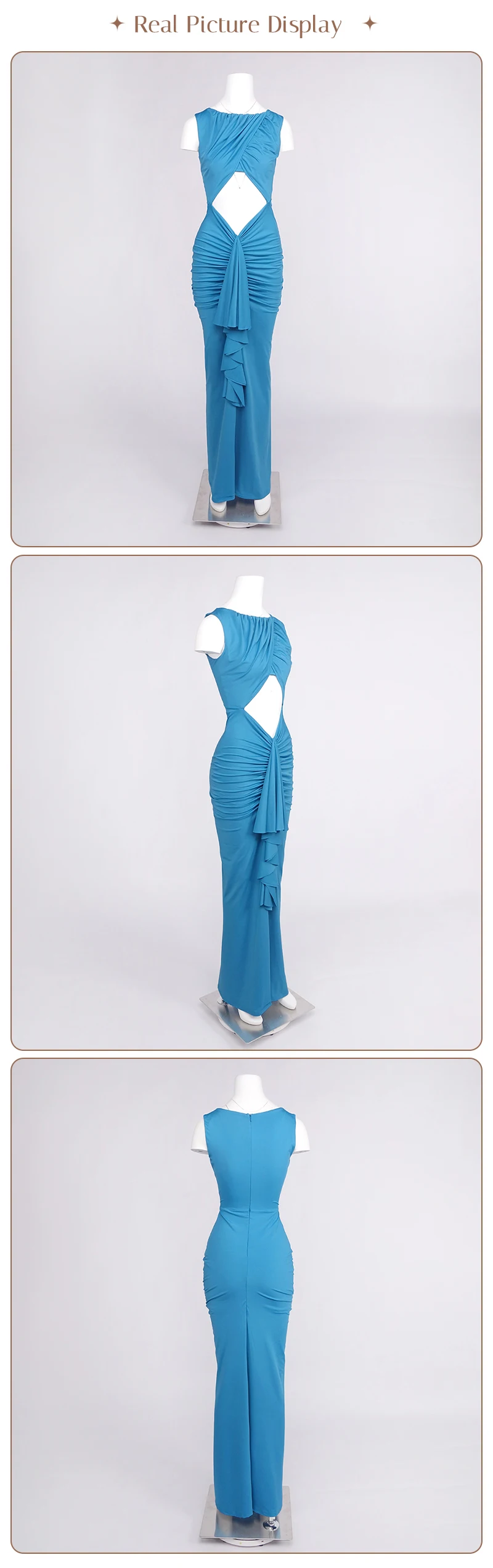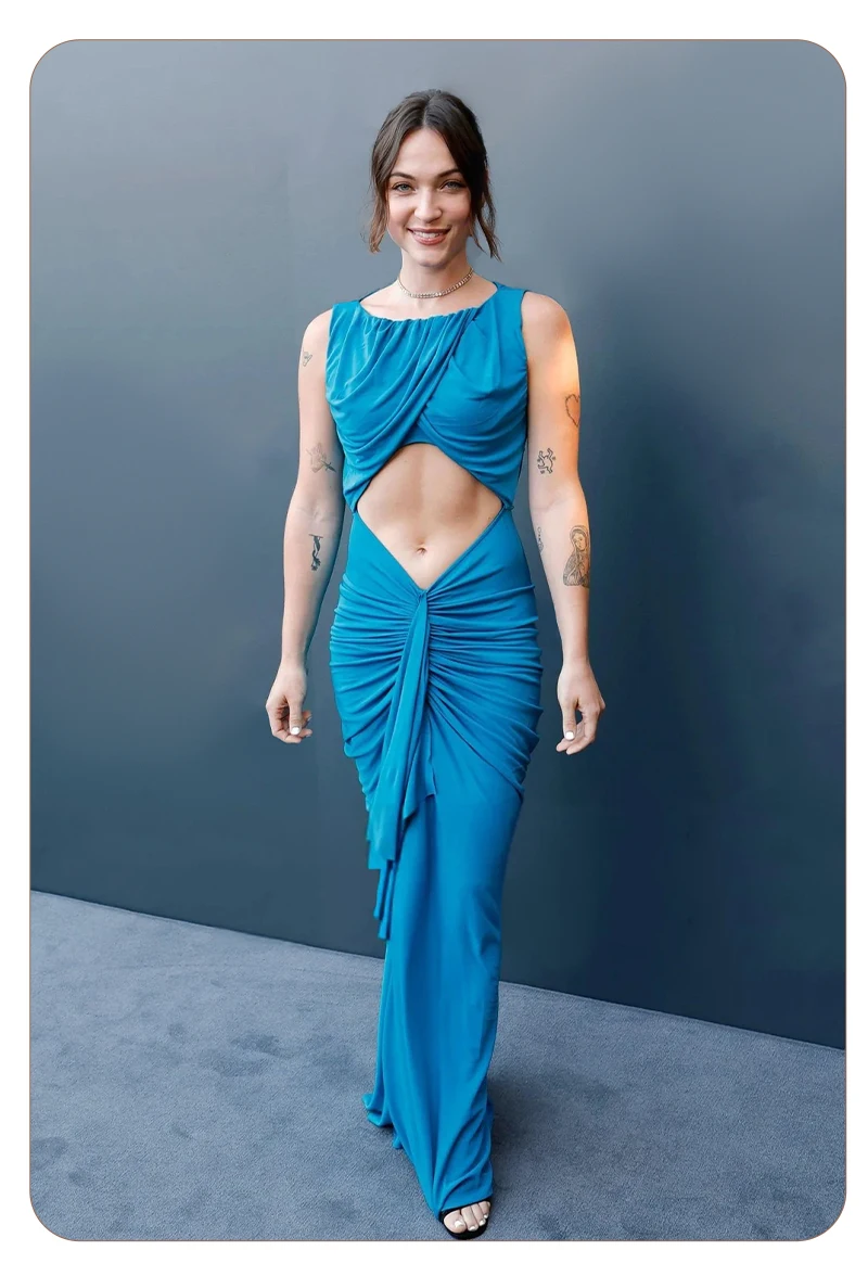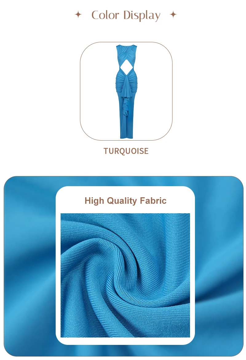 Embrace modern elegance in this cyan draped gown. The crossover - ruched top, waist cutout, and flowing skirt create a sleek yet alluring silhouette — perfect for galas or fashion - forward events where minimalist drama shines.