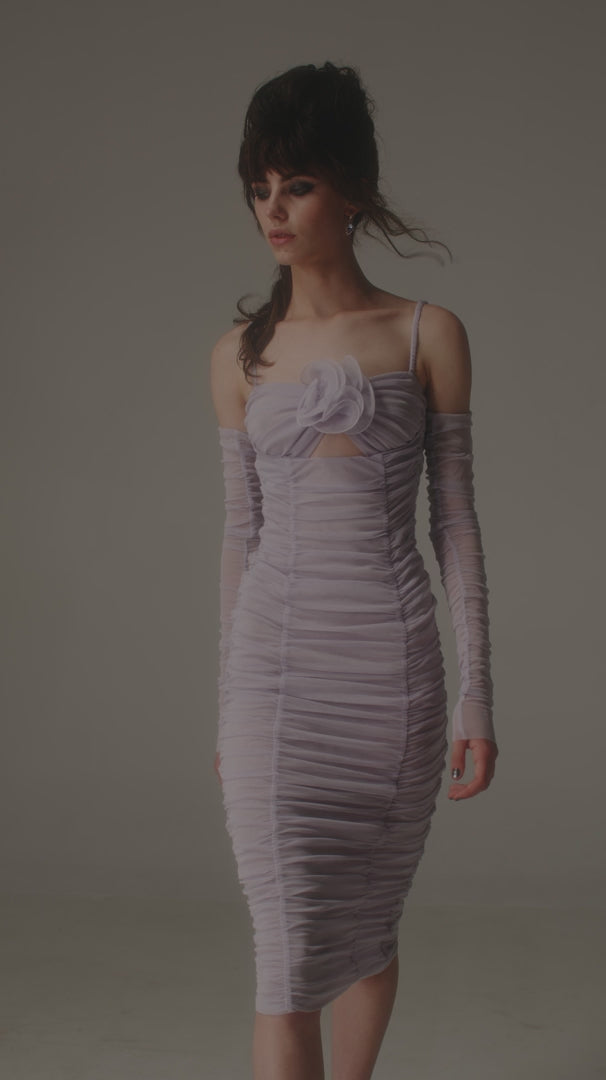 Steal the spotlight on party nights with this lilac ruched midi dress. The off - shoulder sheer sleeves add a touch of allure, while the ruched design flatters your figure. The flower embellishment on the bodice is a charming detail. Ideal for cocktail parties, club events, and upscale social gatherings. Available in multiple sizes.