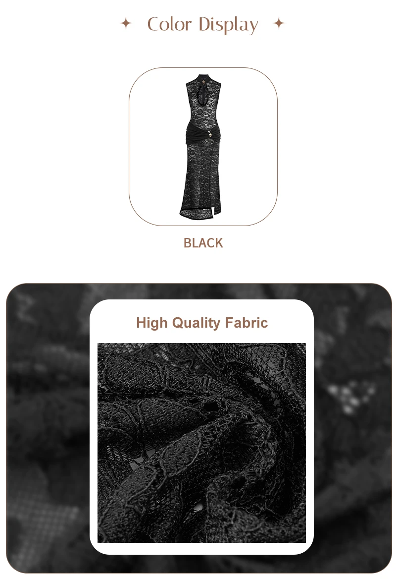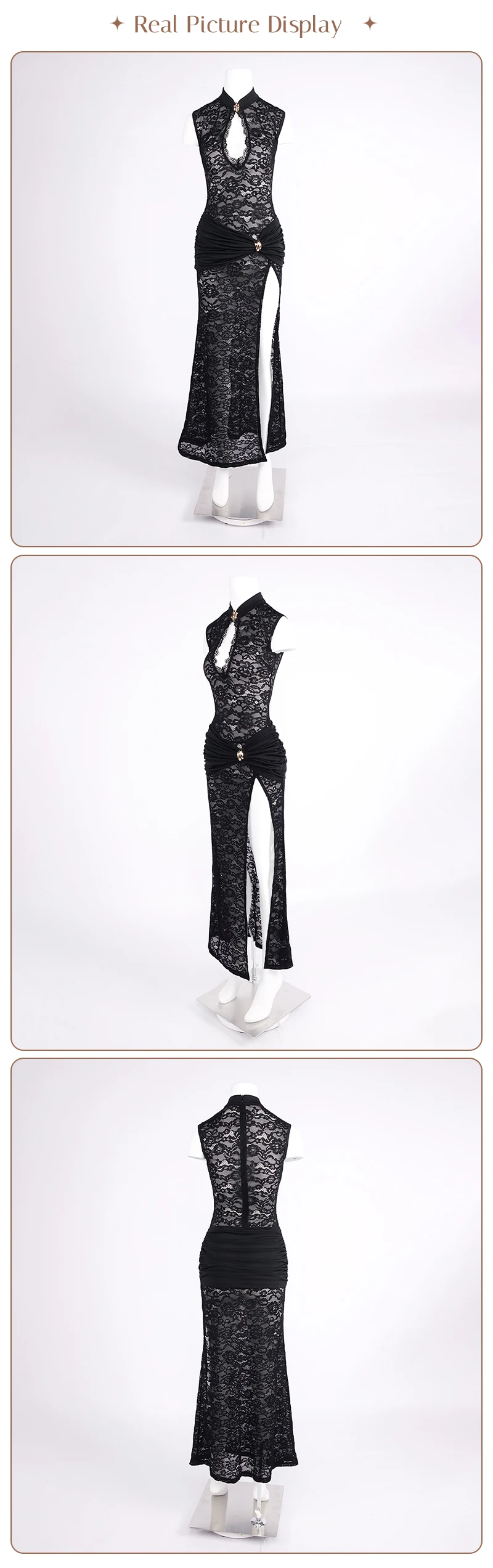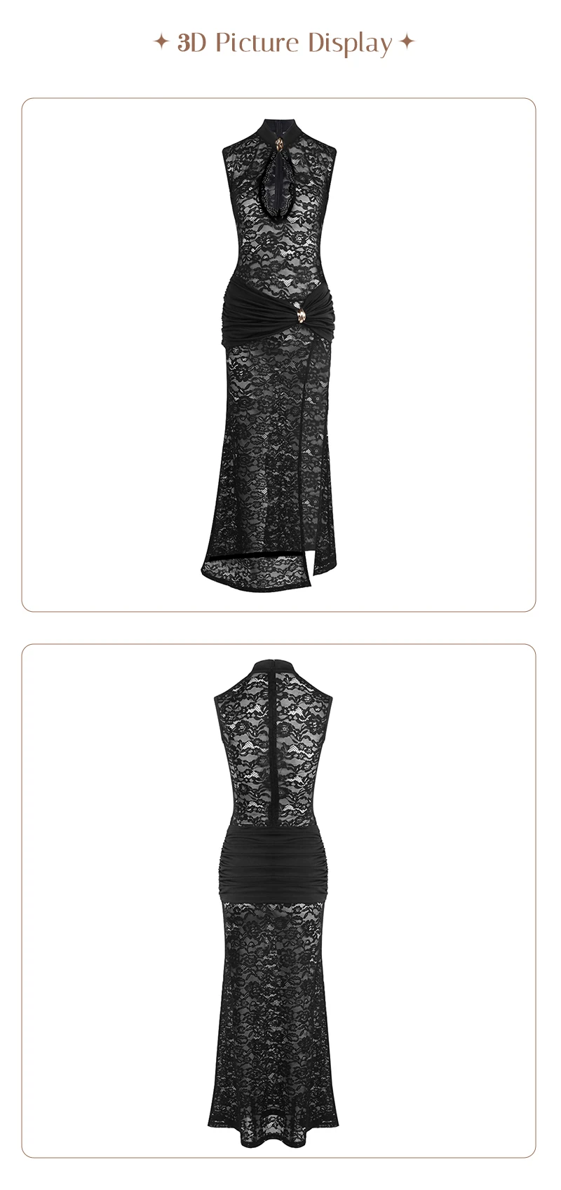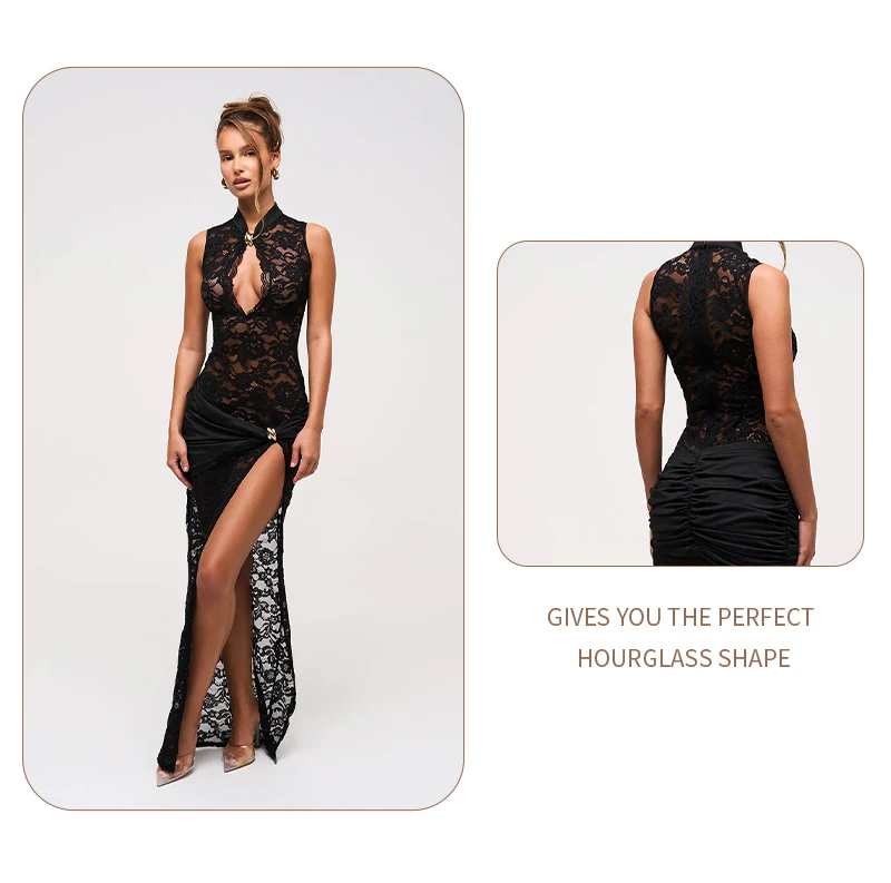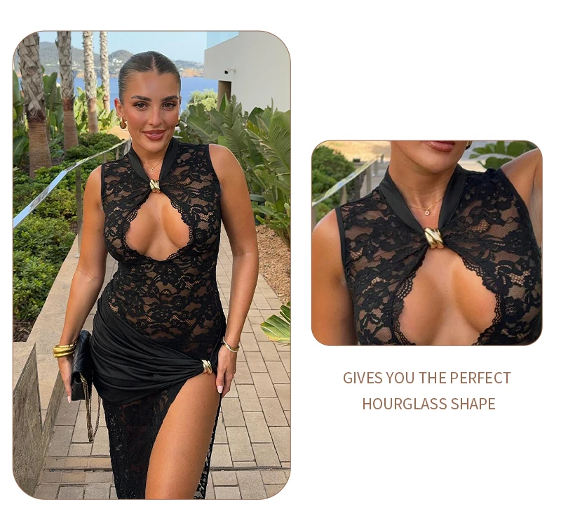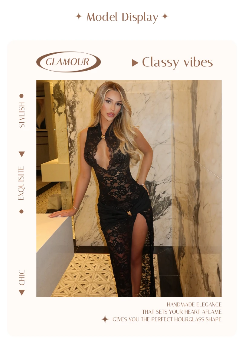 This black lace halter neck maxi dress is the epitome of seductive elegance. The halter neck design, adorned with a decorative clasp, frames the shoulders beautifully while the deep plunge neckline adds a bold and sexy statement. The intricate lace fabric throughout the dress gives it a luxurious and sophisticated feel.
