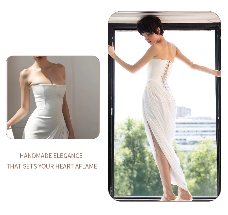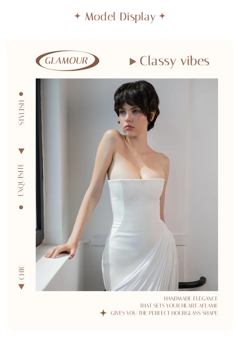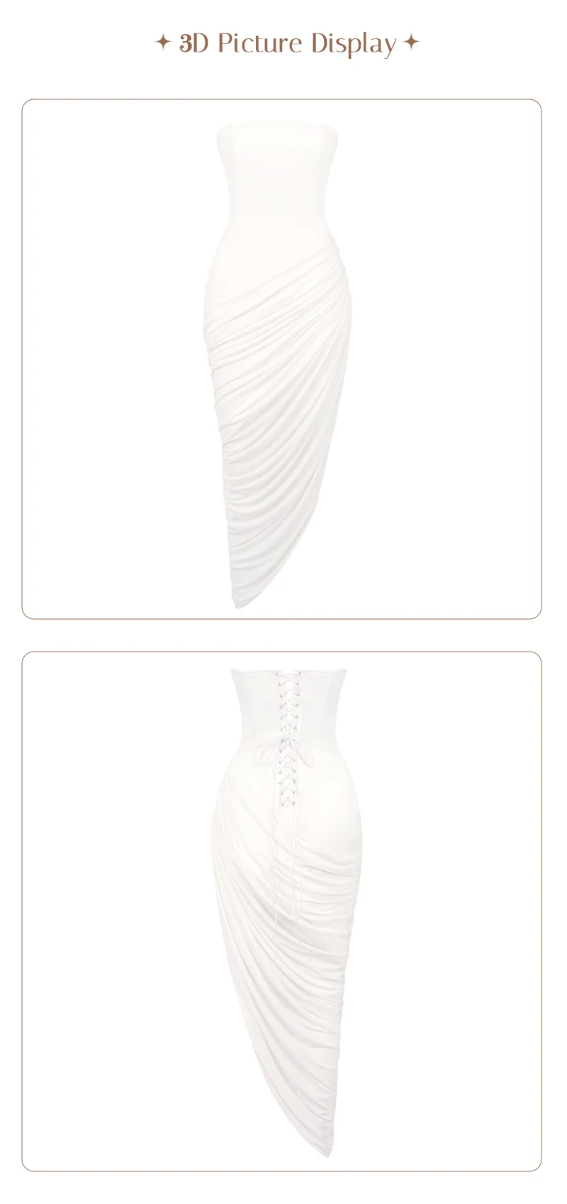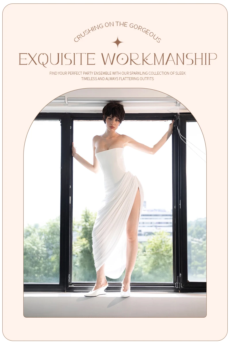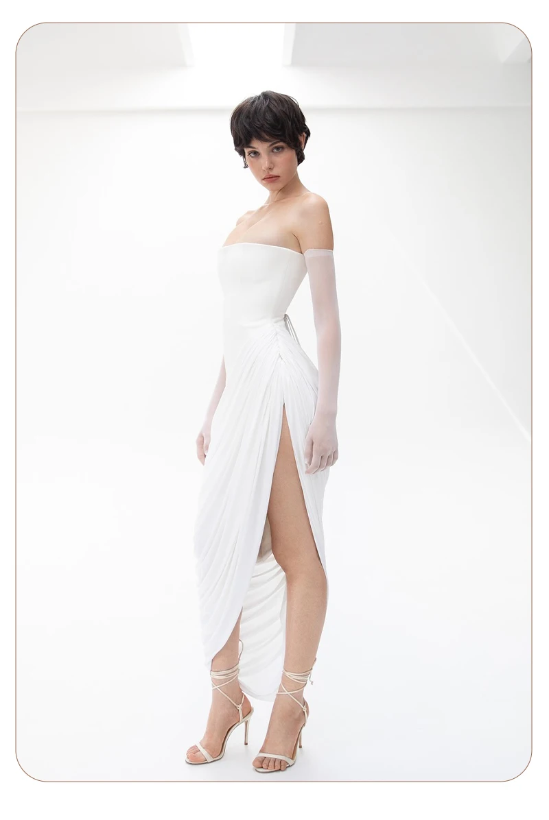 Keywords: white strapless evening dress, draped maxi gown, corset formal dress, elegant slit gown, minimalist white evening dress, modern goddess gown, bridal-inspired formalwear