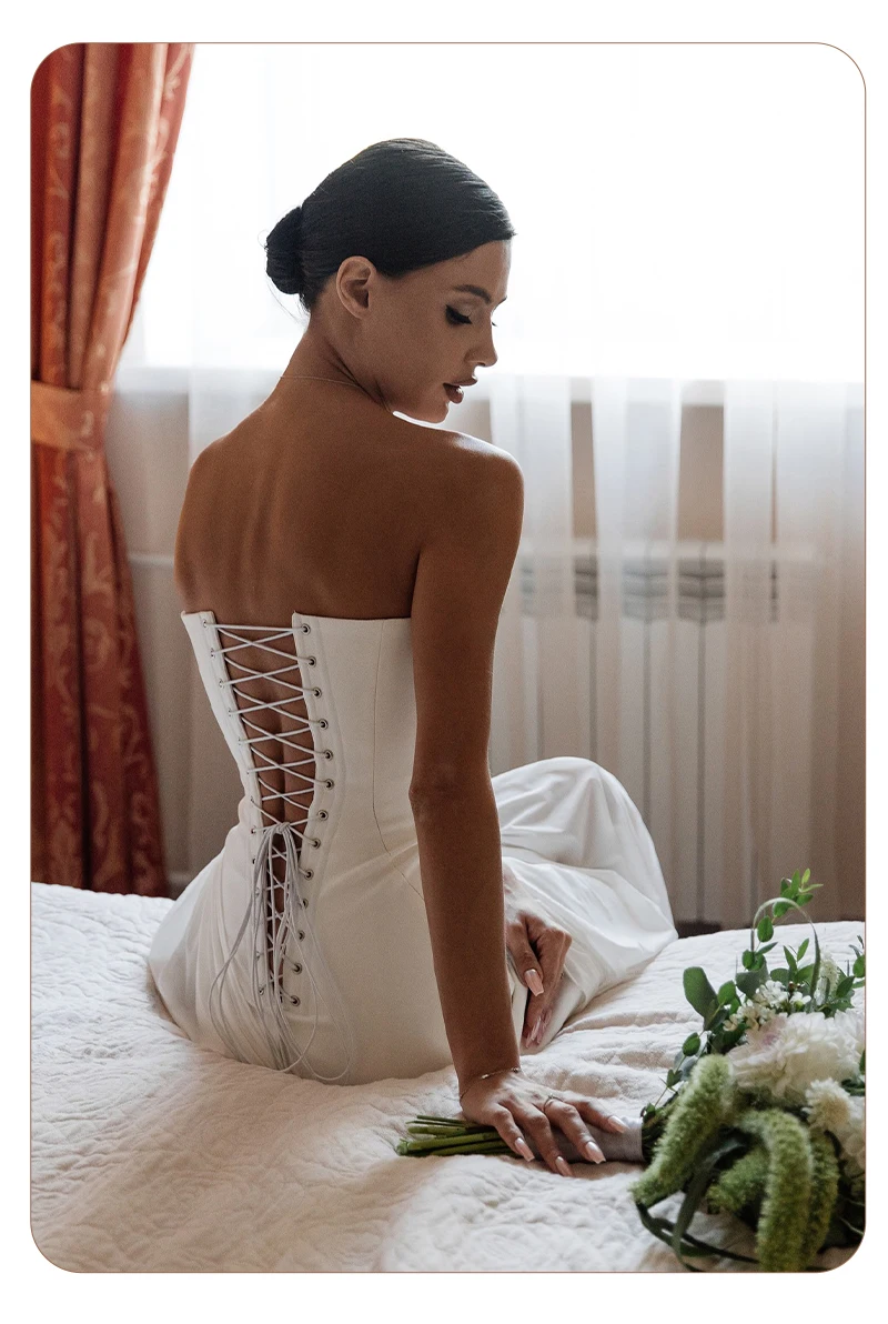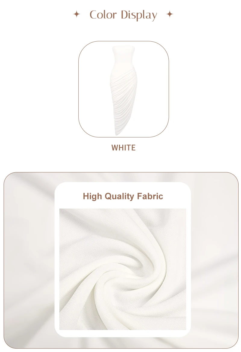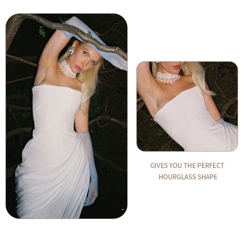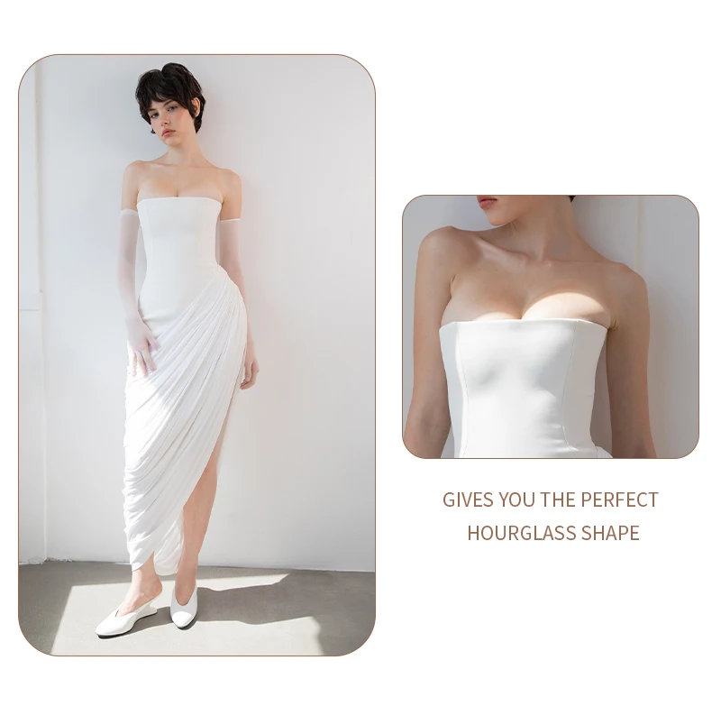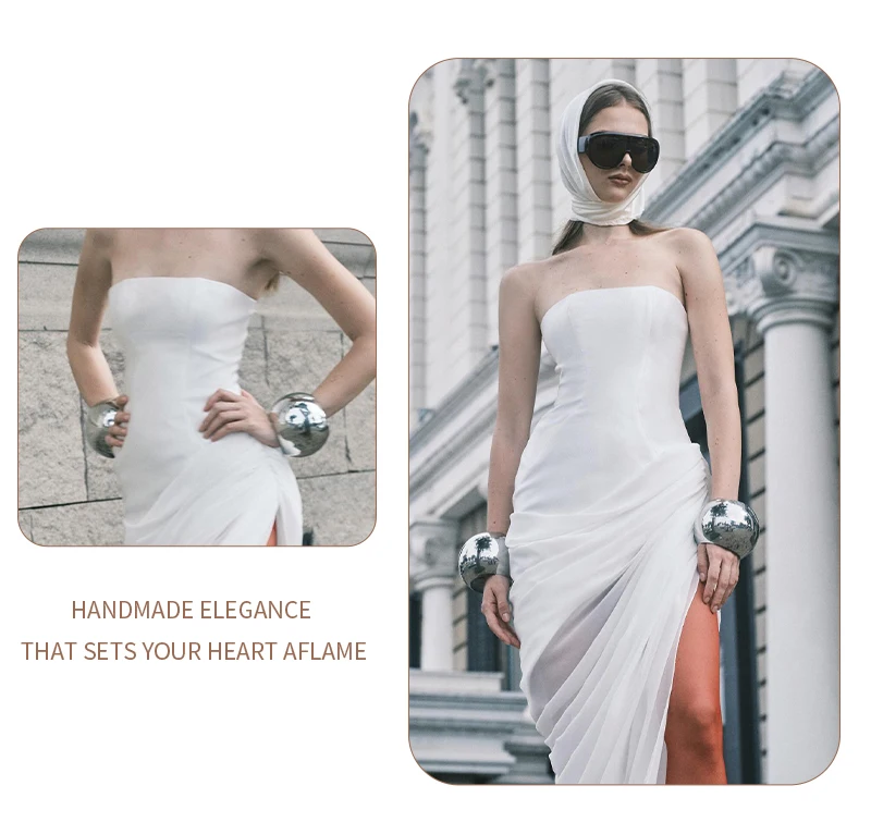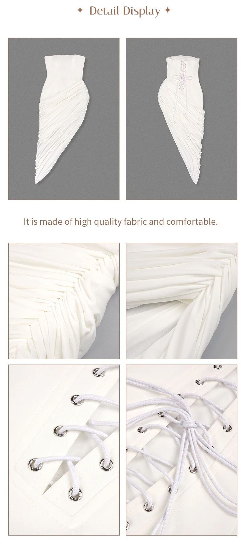 Keywords: white strapless evening dress, draped maxi gown, corset formal dress, elegant slit gown, minimalist white evening dress, modern goddess gown, bridal-inspired formalwear